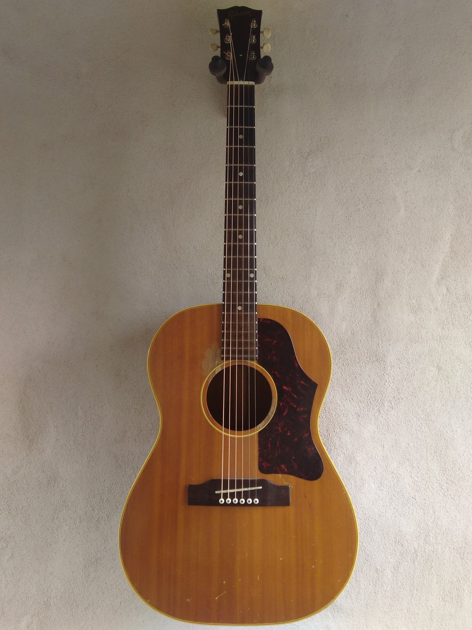 This is my Gibson, given to me by my mom. It’s a B-25 (for all you gearheads who are reading this) from 1963. My mom bought it new for $100 when she was in college. Her father forbid her to buy it and she did anyway in what I gather was an extremely rare act of defiance. I don’t remember ever seeing her play it – it sat in its case in the back room of the house I grew up in, only seeing the light of day on a couple of occasions when my brother attempted to plunk out Metallica riffs.